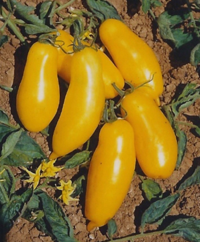 An unusual 4' long Heirloom Tomato with fruit shaped like a small bright yellow banana with pale green stripes which mature to orange. Great sliced in salads and the thick meaty flesh is perfect for sauces, chillies, or eating raw with your favourite herb dip! 80 days from transplanting.