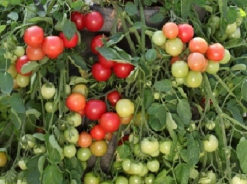 The ideal variety to grow if you are short of space. Compact, cascading and perfect in a patio pot or hanging basket. It only grows 6' tall but tumbles up to 3' over the side of the container producing masses of 1 '' sweet red Tomatoes. Bush. 55 days from transplanting.