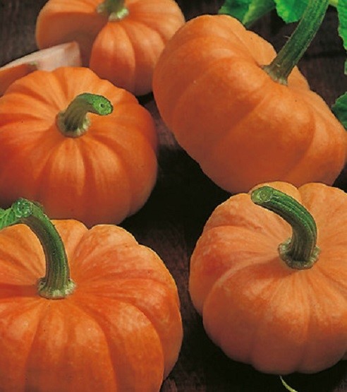 Jack-Be-Little is a small trailing pumpkin. Each plant can produce about 8 cute round, ribbed orange fruits which can be used for miniature Halloween lanterns. The flesh can be used for pumpkin soup and the hollowed out shell can be used for serving various stuffing's.