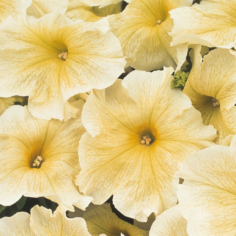 Creamy Marshmallow hanging petunia, often called surfinia trailing dazzles with cascades of cream flowers, intriguingly shaped blooms. Flowers sprout densely from long, hanging stalks, making the green, egg-shaped leaves underneath almost invisible. Such waterfall of flowers may adorn your balcony, terrace or external windows sill.
