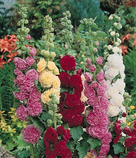 A wonderful mix of fully double peony shaped flowers in crimson, pink, red, yellow, white, and rose. Will flower the first year from seed, bloom is over a very long season. Sturdy plants grow to 5 ft. tall.