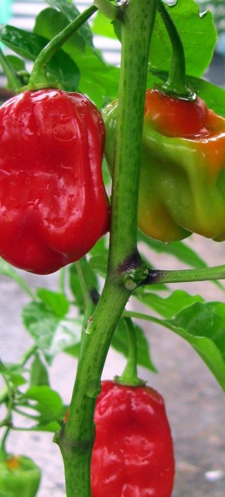 Starts a lovely lime green colour and ripen through a bright orange to red with a wrinkled skin and is usually larger than the traditional Scotch Bonnets, approximately 6 cm long. Plants can reach up to 3 feet 90 cm tall. Heat: Ridiculously Hot - 250,000-300,000 SHUs.