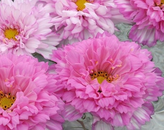 With fully double, rose like, bright pink flowers. The puffy frills gradually open to produce a yellow