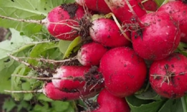 Dark Rosy-scarlet with a white tip. The crunchy flesh has a pleasant flavour. Good value for slicing. "Hot" tasting Radish!
