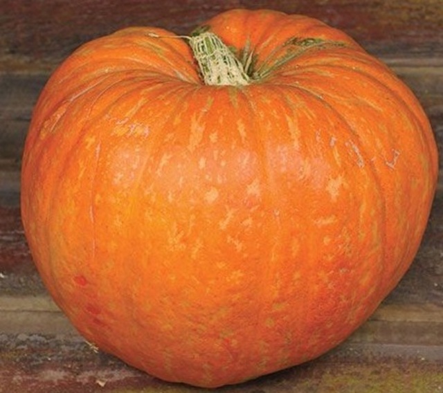 This irregularly shaped pumpkin is golden orange in color with shallow ribs and coarse but edible flesh.