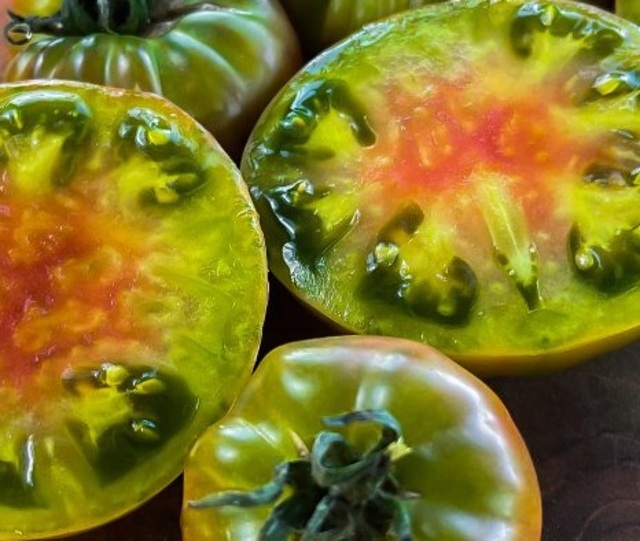 One of the most beautiful looking tomatoes but the taste is fabulous a true tomato in every way, this hard to find heirloom produces big green fruit with a rosy glow. The real treat comes when sliced to reveal a tie dye effect of green, yellow and red. Absolutely delicious; they are sweet and smoky with a slight acidity that balances beautifully. Eat them as a slicing tomato.