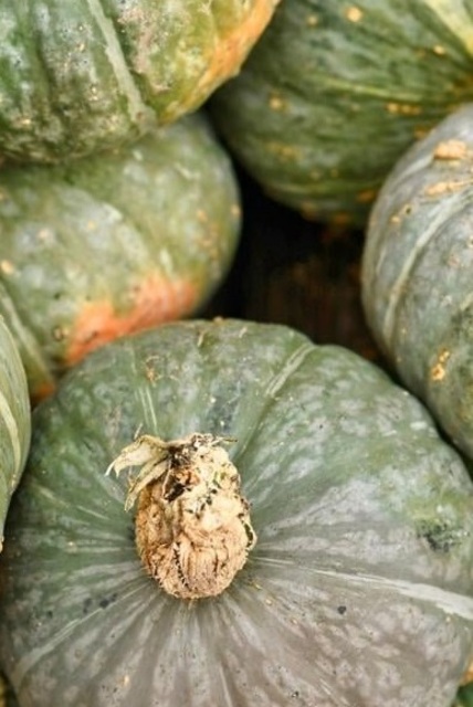 This heirloom variety does not contain any orange, except on the inside! This green pumpkin has dark green skin & light green ribs. However, when you crack open the pumpkin, the inside of the Kabocha is bright orange and contains numerous seeds.