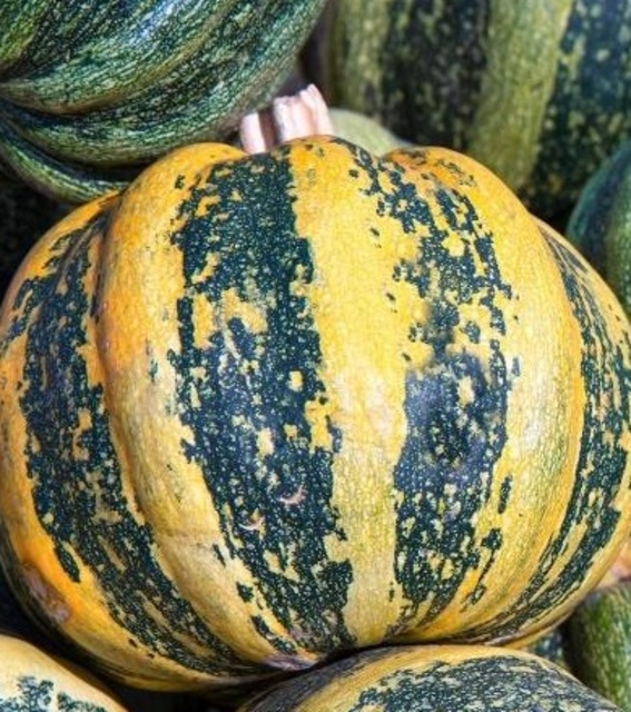This all-purpose heirloom pumpkin is orange in color and contains green / white stripes and not on the skin. Maturing in around 100 days, this medium-small / medium pumpkin grows to between just 3 and 8 kilo's when it is fully formed. Production: 4 - 8 pumpkins per plant. Very rare as it can be used for green pumpkin oil.