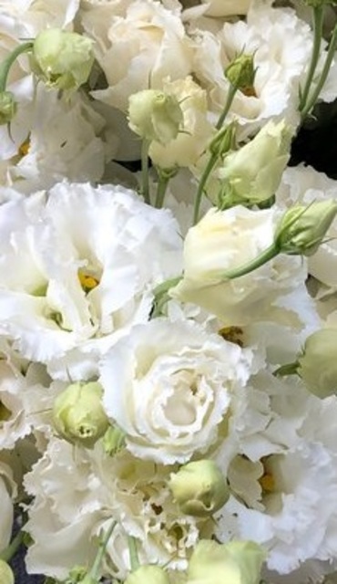 Is a knockout lisianthus with a soft blush of cream dusted on the edges of ruffled white petals. Fully double blooms are lush with abundant layering and ruffling.