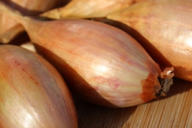 Longor 'Old French Banana' Shallot. Enjoyed for it's mild flavour and delicious sweet taste, widely used in French cooking. 'Longor' is recognized for it's elongated shape, red-skin and pink flesh with great storage potential.